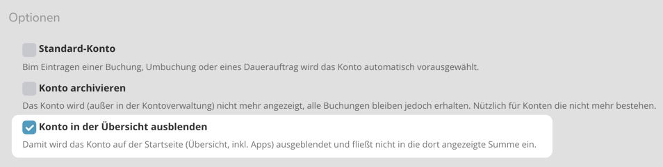 Für den Fall, dass dir einzelne Konten, Budgets oder Sparziele weniger wichtig sind, kannst du diese nun jeweils auf der Startseite / Monatsübersicht ausblenden.