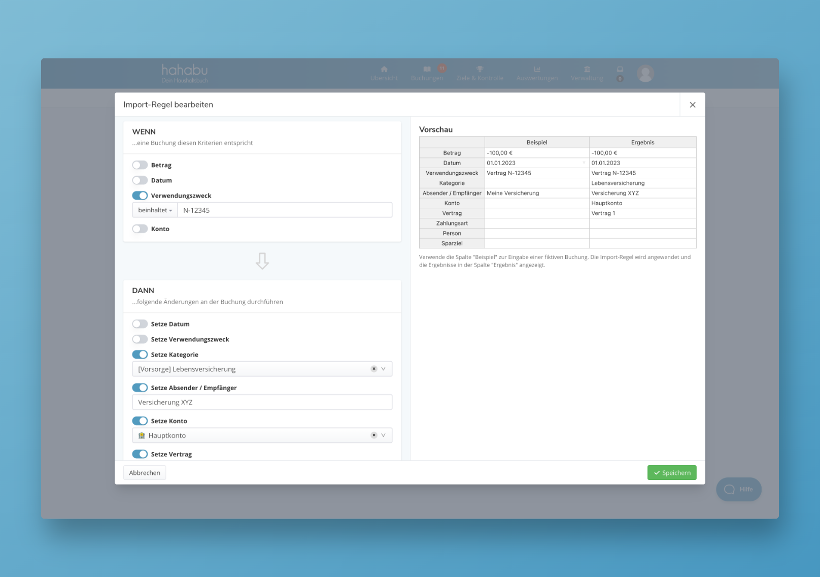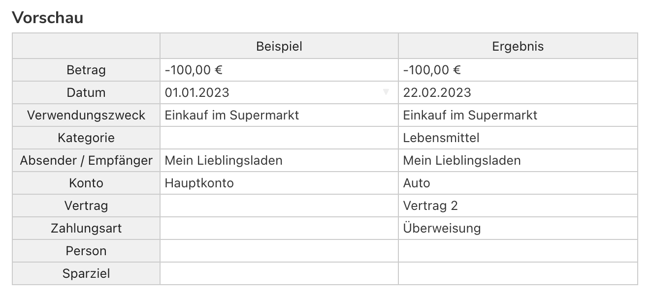 Beim Erstellen der Import-Regel wird eine Vorschau eingeblendet. Die Vorschau enthält ein Beispiel für eine Buchung, wobei die Buchung von dir verändert werden kann. Du kannst damit testen, ob deine Import-Regel auf das Beispiel zutrifft und wie diese anschließend bearbeitet wird.