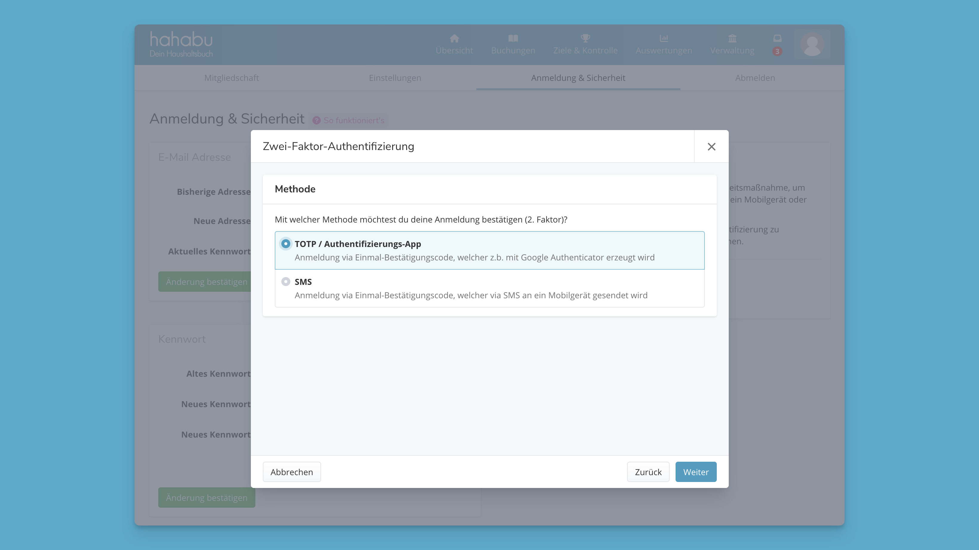 Dein Haushaltsbuch kann jetzt durch eine zusätzliche Sicherheitsebene geschützt werden: die Zwei-Faktor-Authentifizierung (2FA), welche verlangt, dass Nutzer bei der Anmeldung neben ihrem Passwort einen zweiten Sicherheitscode eingeben. Dieser Bestätigungscode wird entweder über eine Authentifizierungs-App wie z.B. Google Authenticator generiert oder direkt per SMS an dein Mobiltelefon gesendet. Wir empfehlen allen Nutzern die Nutzung dieser Funktion.